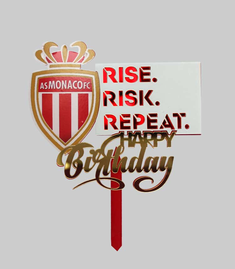 Sublimez votre gâteau avec notre topper cake AS Monaco, incluant l’inscription anniversaire et le slogan “Rise, Risk, Repeat”.