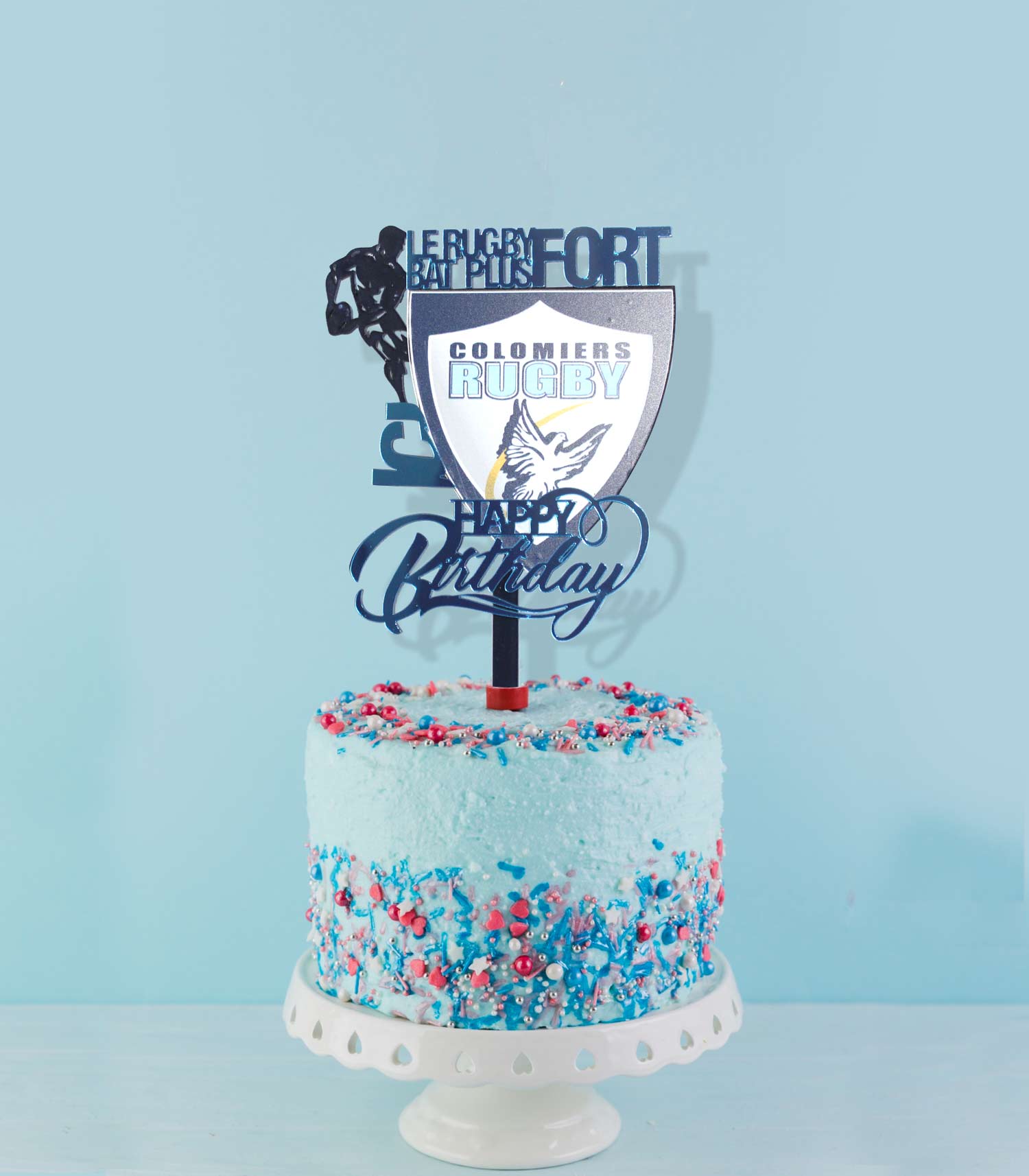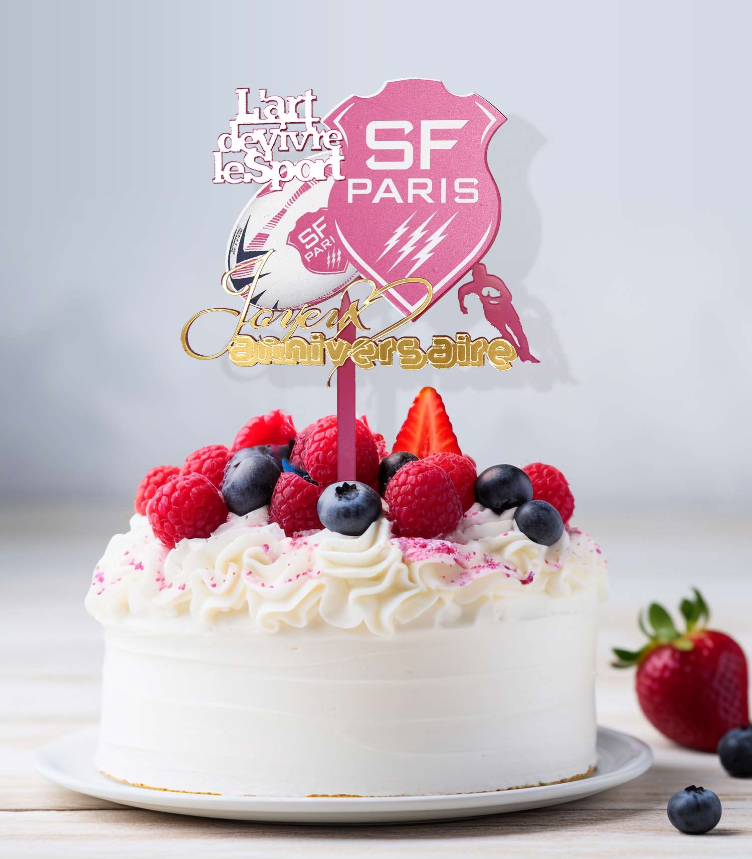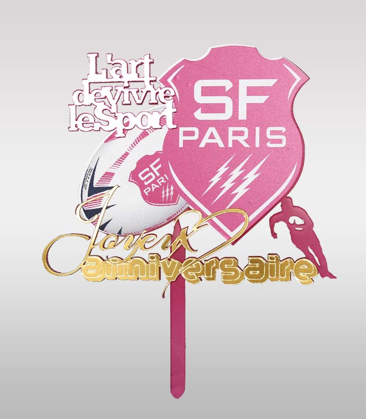 Ajoutez une touche d’élégance et d’originalité à votre gâteau avec ce topper cake SF Paris Rugby en acrylique rose miroir, accompagné du slogan emblématique “L’art de vivre le sport ”. Une décoration parfaite pour les passionnés de rugby et les supporters du club parisien.